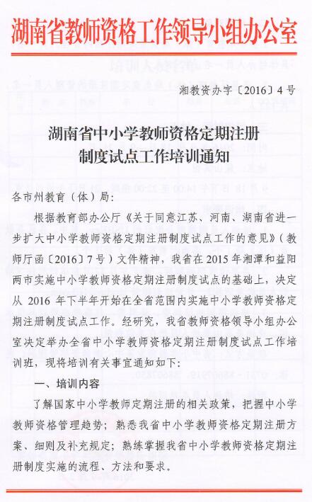 湘教资办字〔2016〕4号 湖南省中小学教师资格定期注册制度试点工作培训通知