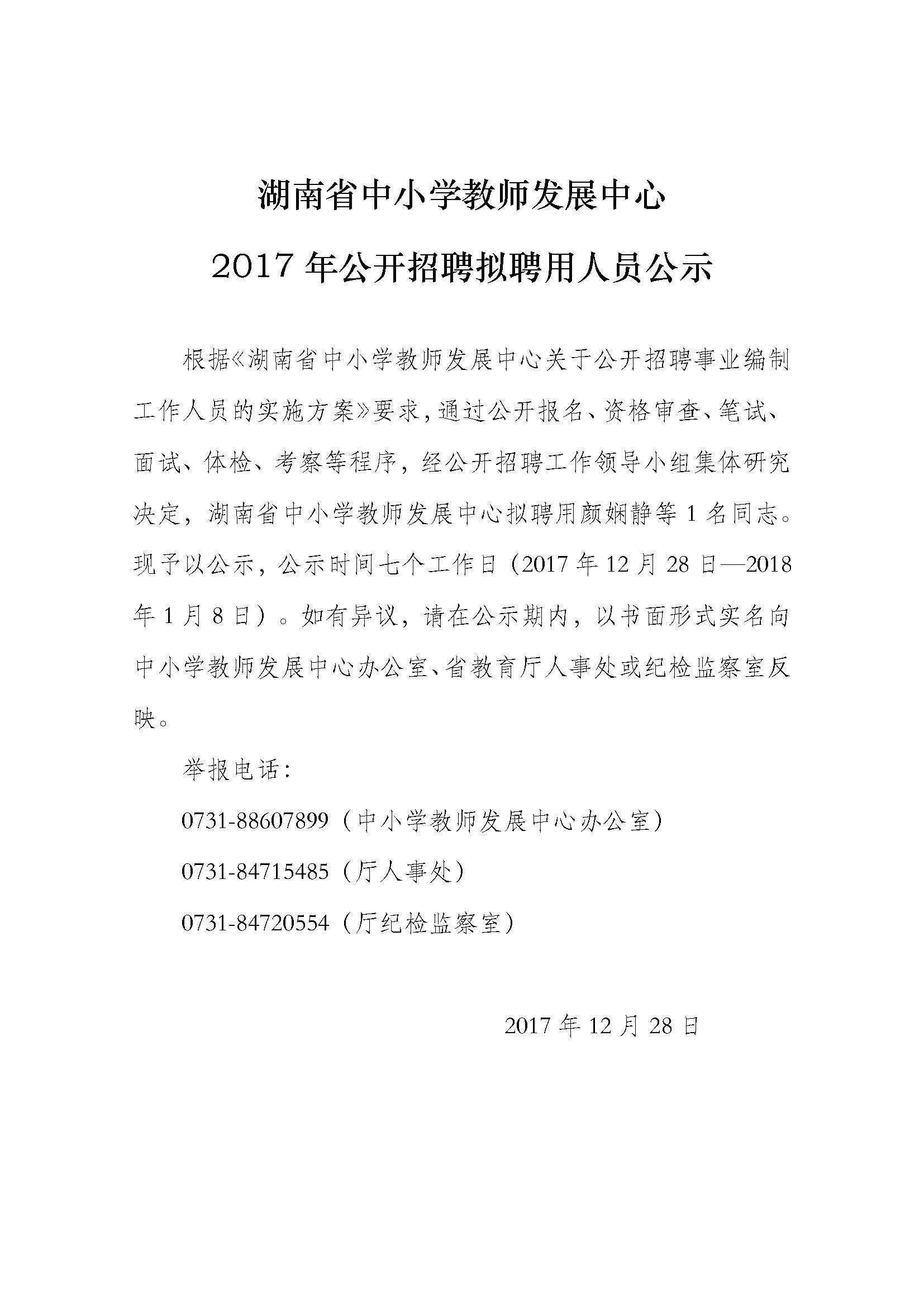 湖南省中小学教师发展中心2017年公开招聘拟聘用人员公示