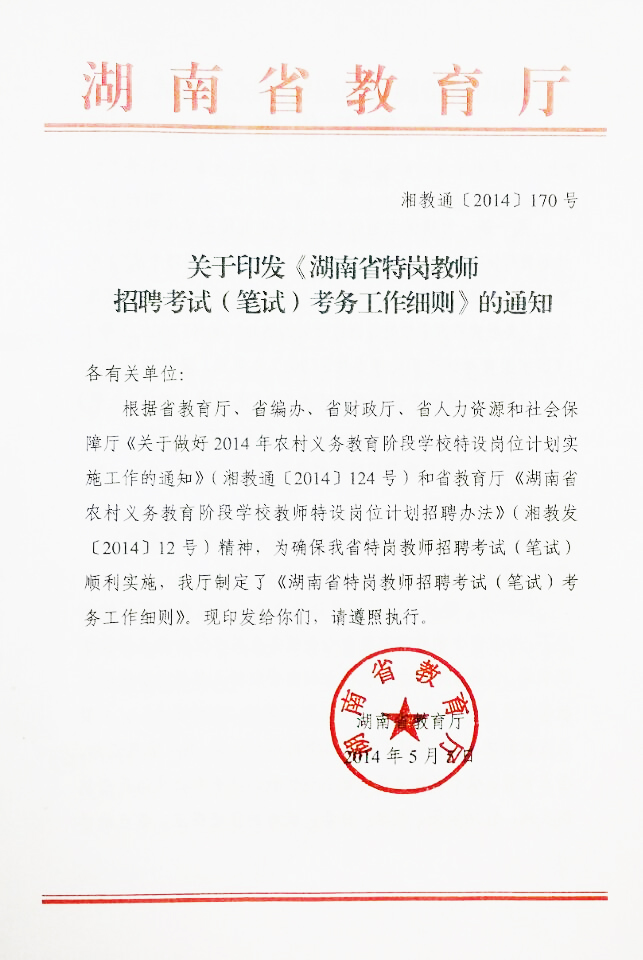 关于印发《湖南省特岗教师招聘考试(笔试)考务工作细则》的通知